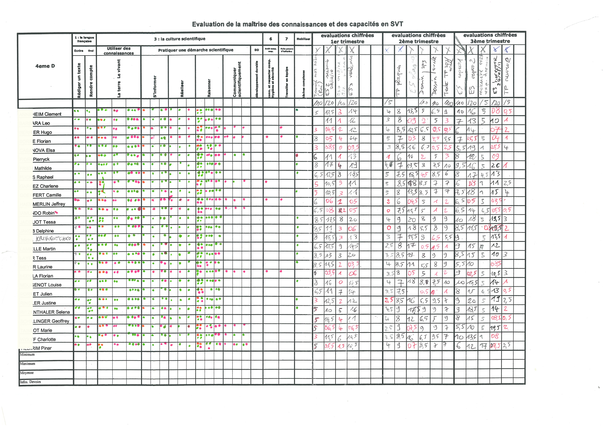 -à droite le carnet de note classique séparé en 3 trimestres, chaque colonne correspond à une évaluation sommative chiffrée